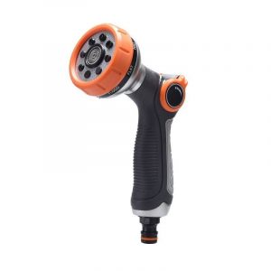 Πιστόλι ποτίσματος για λάστιχο, με 8 διαφορετικές ρυθμίσεις ψεκασμού. Διαθέτει εύχρηση βαλβίδα ώθησης αντίχειρα. Κατασκευασμένο από ενισχυμένο πλαστικό, ανθεκτικό στις υψηλές πιέσεις.