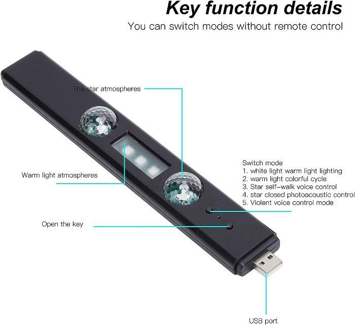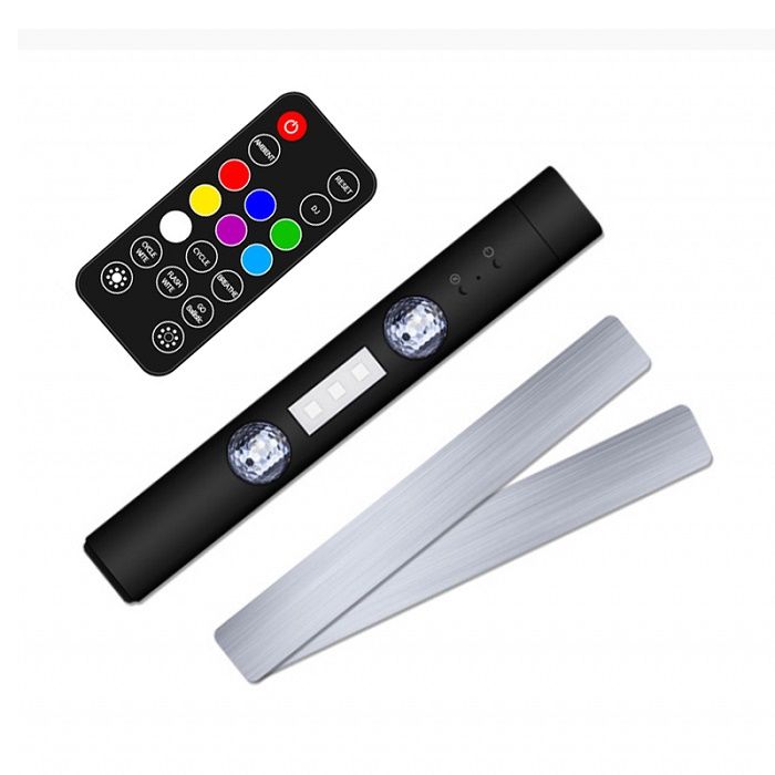 Επαναφορτιζόμενο φωτορυθμικό LED με πολύχρωμο φωτισμό που δημιουργεί μια εντυπωσιακή ατμόσφαιρα και μπορεί πολύ εύκολα να τοποθετηθεί παντού: στο αυτοκίνητο, το σαλόνι, το δωμάτιο, τη σκηνή camping κτλ. Διαθέτει διπλό αυτοκόλλητο μαγνήτη: τοποθετείτε το ένα τμήμα στο σημείο που θέλετε να τοποθετήσετε το φωτιστικό και το άλλο τμήμα στο πίσω μέρος του προϊόντος. Διαθέτει ενσωματωμένο USB φόρτισης το οποίο μπορείτε να τοποθετήσετε σε οποιοδήποτε κοινό αντάπτορα πρίζας USB, σε Powerbank ή στη θύρα του υπολογιστή σας. Διαθέτει λειτουργία απλού φωτισμού χάρη στη μεσαία λάμπα, με επιλογή χρώματος και λειτουργία φωτορυθμικού με τις δυο περιστρεφόμενες μπάλες LED, με επιλογή χρώματος. Χρώματα φωτισμού: κόκκινο/μπλε/πράσινο/κίτρινο/μωβ/λευκό. Διαστάσεις: 230*55*35mm. Βάρος: 130g.
