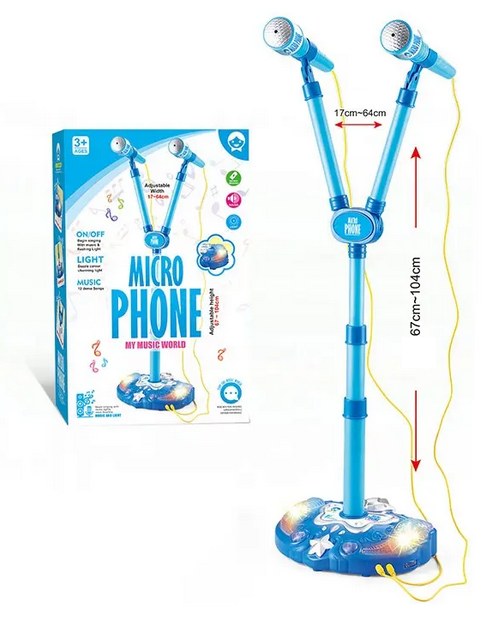 Σετ καραόκε με δύο μικρόφωνα, με φωτισμό LED, μουσική και εφέ. Διαθέτει σταντ με ρυθμιζόμενο ύψος 67-104cm.