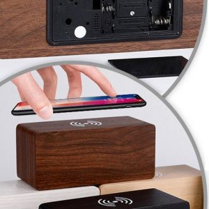 Ψηφιακό ρολόι–Ξυπνητήρι LED, με βάση ασύρματης φόρτισης smartphone, σε ιδιαίτερο σχεδιασμό με εφέ ξύλου.