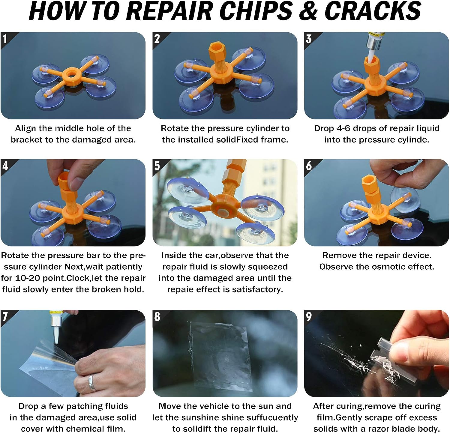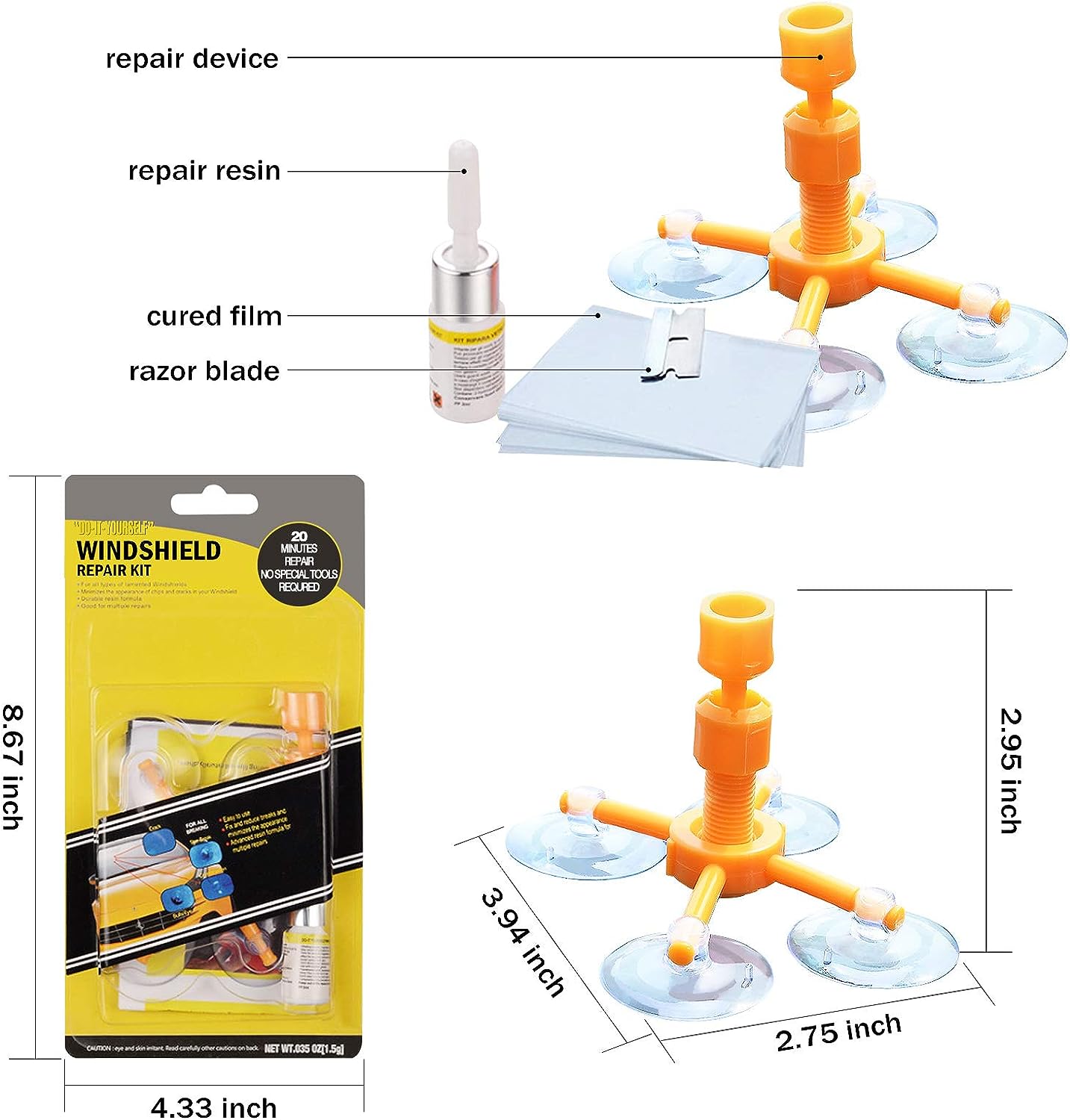 Επισκευάστε μικροζημιές και μικρά ραγίσματα στο παρμπρίζ σας, εύκολα γρήγορα και κύριως οικονομικά, με αυτό το πλήρες κιτ επισκευής κρυστάλλων αυτοκινήτου με ειδικό υγρό που θα “”γεμίσει”” και σχεδόν θα εξαλείψει οποιαδήποτε γρατσουνιά ή ράγισμα υπέστη το παρμπρίζ σας. Μπορεί να επαναφέρει ράγισμα έως και 15cm. Το κιτ περιλαμβάνει: 1 * Συσκευή συγκράτησης με βεντούζες,