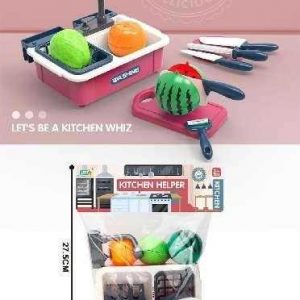 Παιχνίδι νεροχύτης κουζίνας με αξεσουάρ σκεύη και τρόφιμα, σε υπέροχο πολύχρωμο σχεδιασμό.