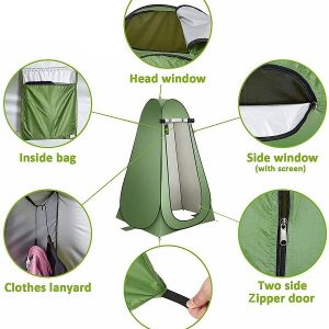 Σκηνή camping αποδυτήριο-ντουζ με ανθεκτικό σκελετό, πολύ εύκολη στο στήσιμο. Πανί από 100% αδιάβροχο πολυεστερικό ύφασμα και αδιάβροχη βάση. Διαθέτει αεριζόμενη οροφή, ιμάντα-κρεμάστρα στο εσωτερικό και πορτάκι με φερμουάρ.