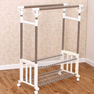 Τροχήλατη κρεμάστρα δαπέδου διπλή με 2 ράφια πολλαπλών χρήσεων, ιδανική ως έπιπλο εισόδου ή για την οργάνωση των ρούχων στο δωμάτιό σας. Μεταλλικός σκελετός. Ύψος ρυθμιζόμενο 95-160cm. Μήκος κρεμάστρας ρυθμιζόμενο 100-150cm. Πλάτος: 40 cm.