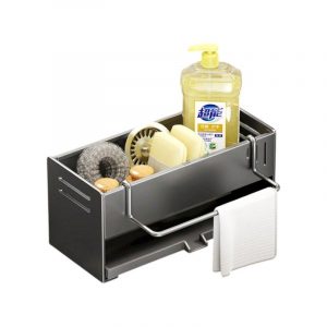 Βάση οργάνωσης νεροχύτη κουζίνας με θήκη για σαπούνι/σφουγγάρι και αξεσουάρ, με μεταλλική κρεμάστρα πανιού inox και βάση με ειδική δίοδο για την αποβολή του νερού στον νεροχύτη σας.