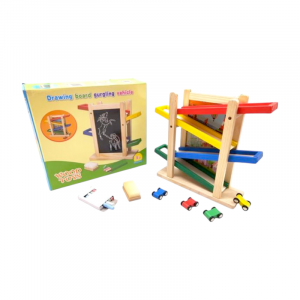 Αυτοκινητόδρομος τσουλήθρα ξύλινος και πίνακας ζωγραφικής με πλήρες σετ ζωγραφικής και ξύλινα αυτοκινητάκια, για ένα συναρπαστικό παιχνίδι 2 σε 1.