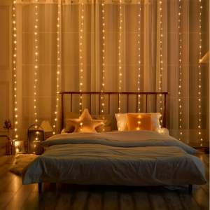 Χριστουγεννιάτικα διακοσμητικά φώτα LED τύπου Κουρτίνα, με χρώμα φωτισμού θερμό λευκό και ρυθμιζόμενα προγράμματα.