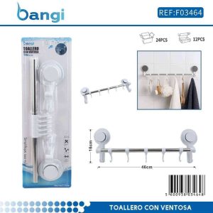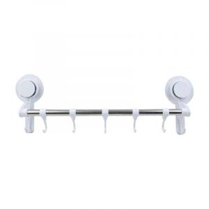 Κρεμάστρα πετσέτας μπάνιου με άγκιστρα κρεμάσματος ρυθμιζόμενης θέσης, με μεταλλική ράγα inox και πλαστικές βάσεις υψηλής ανθεκτικότητας. Εύκολη τοποθέτηση με ισχυρές βεντούζες, χωρίς να απαιτείται βίδωμα.