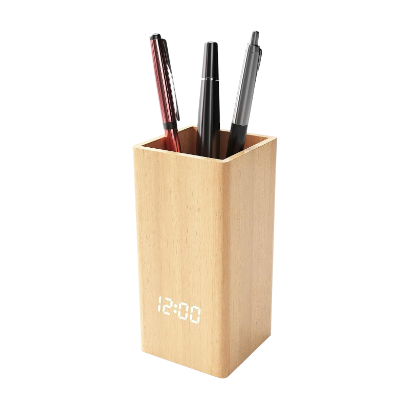 Ψηφιακό ρολόι–Ξυπνητήρι LED & μολυβοθήκη, σε ιδιαίτερο σχεδιασμό με εφέ ξύλου. Πρακτικό μέγεθος που μπορεί να τοποθετηθεί παντού και να προσδώσει σύγχρονη νότα στο χώρο σας.