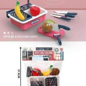 Παιχνίδι νεροχύτης κουζίνας με αξεσουάρ σκεύη και τρόφιμα, σε υπέροχο πολύχρωμο σχεδιασμό.