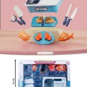 Παιχνίδι νεροχύτης κουζίνας με αξεσουάρ σκεύη και τρόφιμα, σε υπέροχο πολύχρωμο σχεδιασμό.
