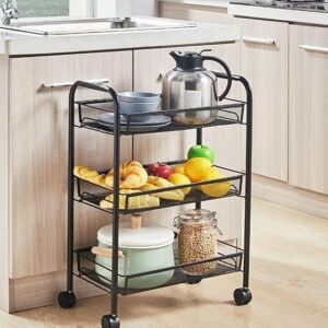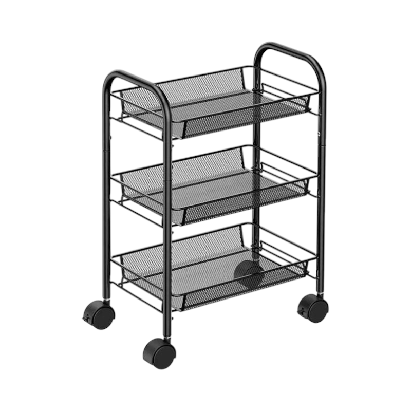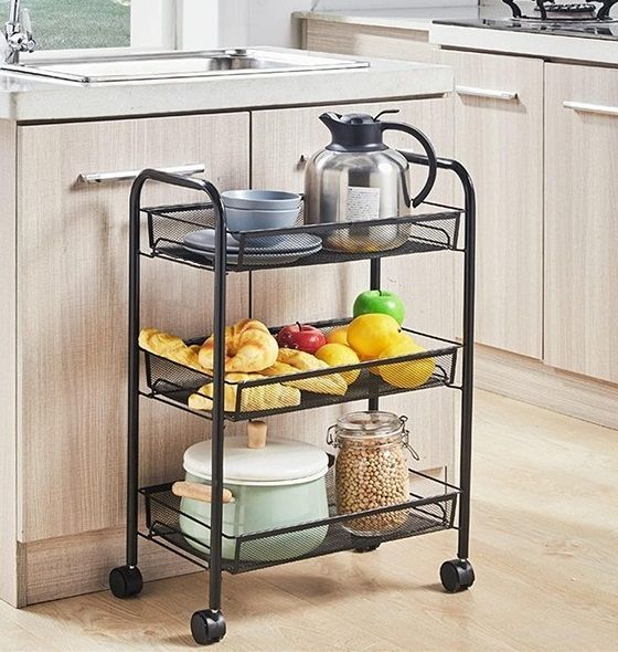 Μεταλλική, τριώροφη ραφιέρα-μανάβης, τρόλει για εύκολη μετακίνηση.