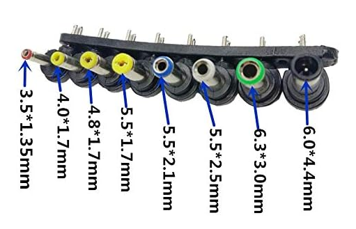 • Connectors: 6 x 1mm / 6.3 x 3.0mm / 5.5 x 2.5mm / 5.5 x 2.1mm / 5.5 x 1.7mm / 4.8 x 1.7mm / 4.0 x 1.7mm / 3.5 x 1.75mm