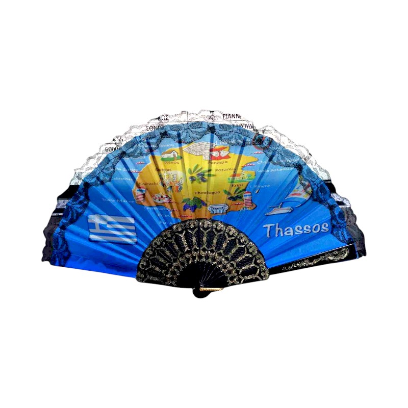 Βεντάλια χειρός Souvenir με τύπωμα και σχέδια που αντιπροσωπεύουν την Ελλάδα, κατασκευασμένη από πολυεστερικό ύφασμα με ανεξίτηλα χρώματα υψηλής ποιότητας και πλαστική, ανθεκτική χειρολαβή.